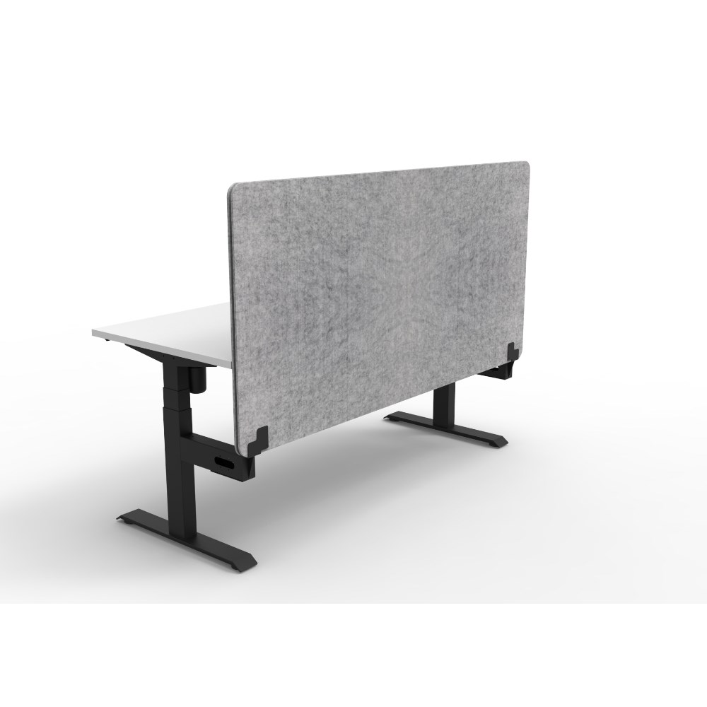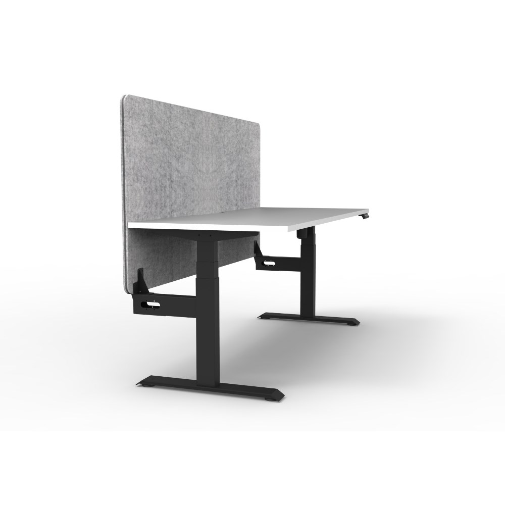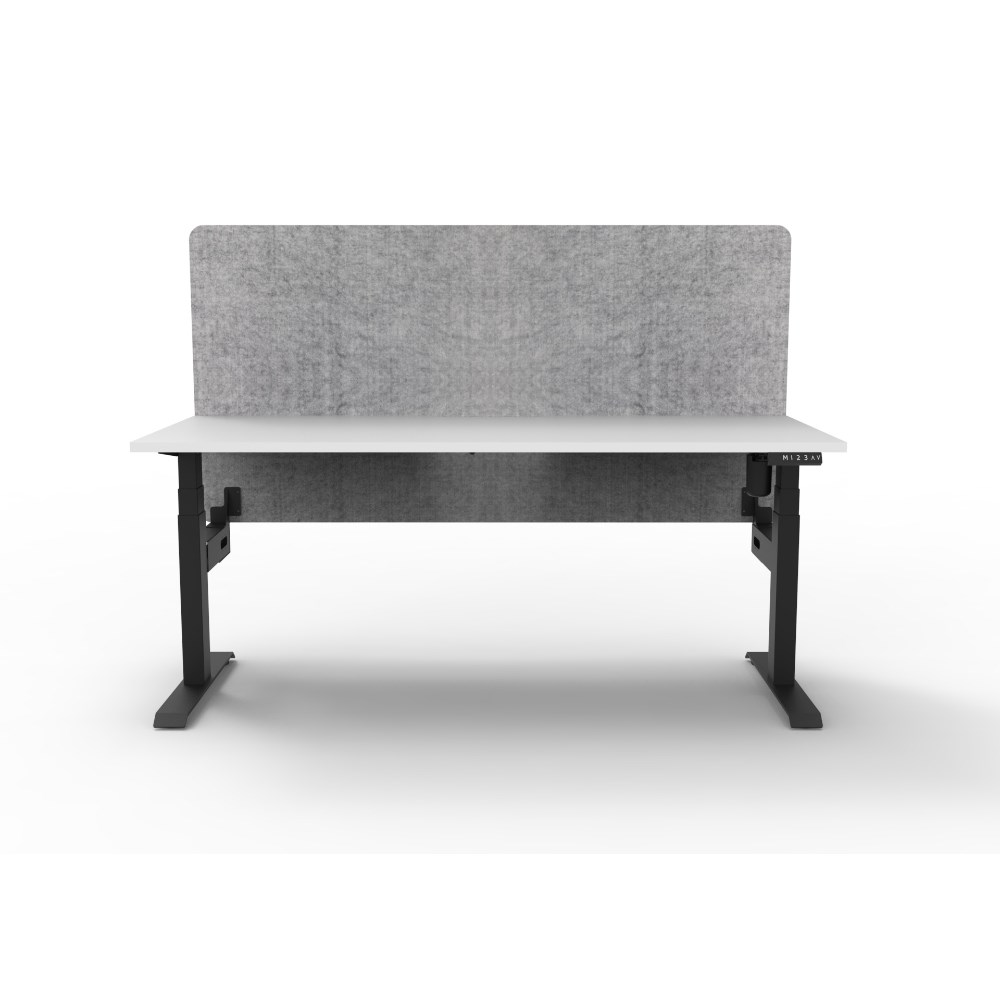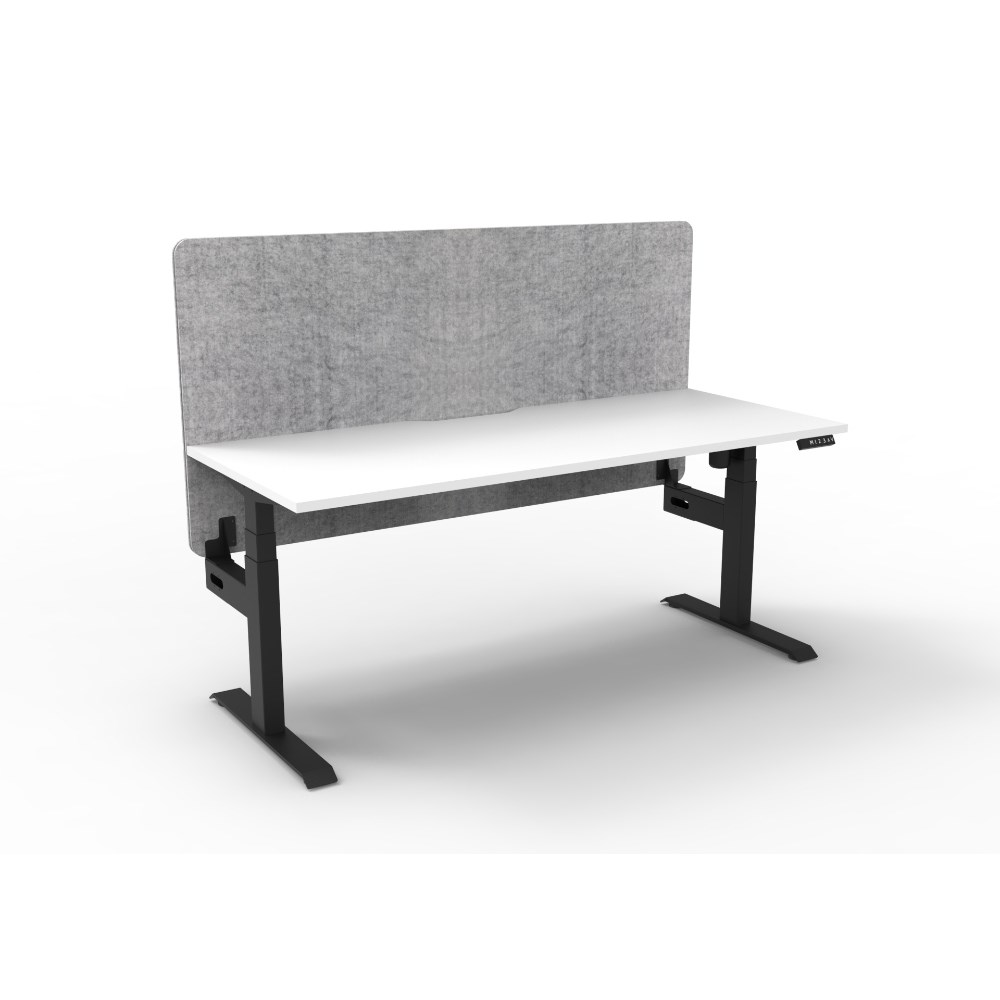 • Electric height adjustable single sided workstation with Natural White top and Black Satin frame, Grey Eco screen.