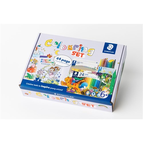 • Includes 64 page colouring book, 24 Natural Coloured Hexagonal Pencils, 12 Noris Wax Twister Crayons and 24 Luna Fibre-Tip Pens.