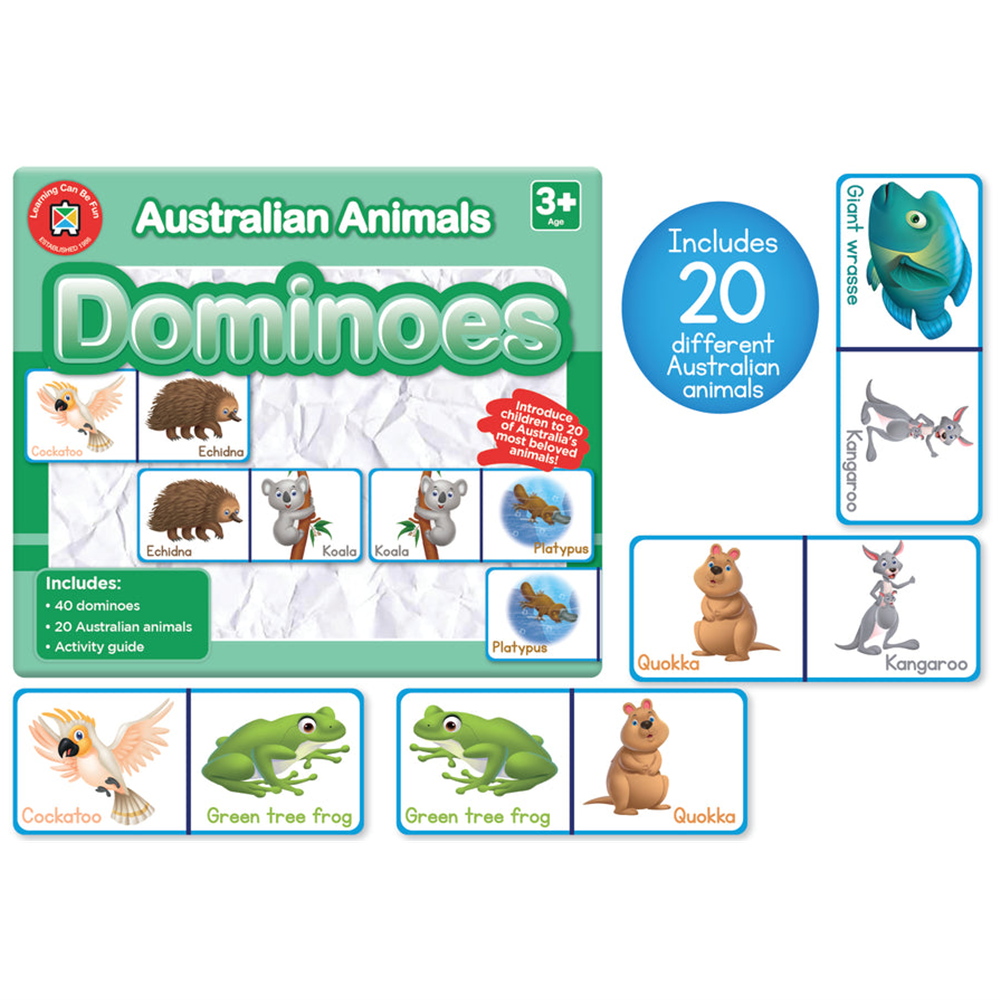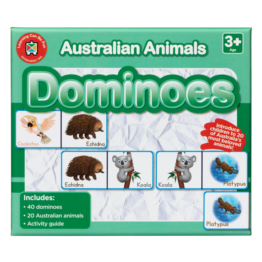 Featuring beautiful hand-drawn illustrations, these dominoes offer a fun and engaging way for children to learn about some of Australia’s most beloved native animals. The set includes 20 different animals—from koalas and kangaroos to sugar gliders, kookaburras, and more.
