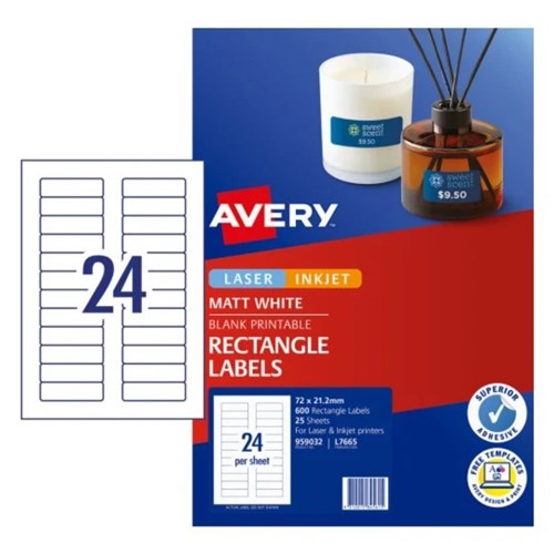 Avery Blank Printable Labels L7665 72 x 21.15mm Rectangle Matte White 24UP 600 Labels
