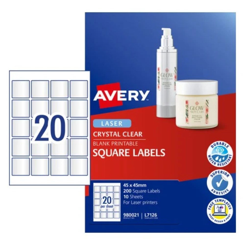 Avery Crystal Clear Labels L7126 45 x 45mm Square Clear 20UP 200 Labels 10 Sheets