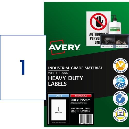 Avery Identification Removable Heavy Duty Laser White L4775 208x295mm 1UP 20 Labels