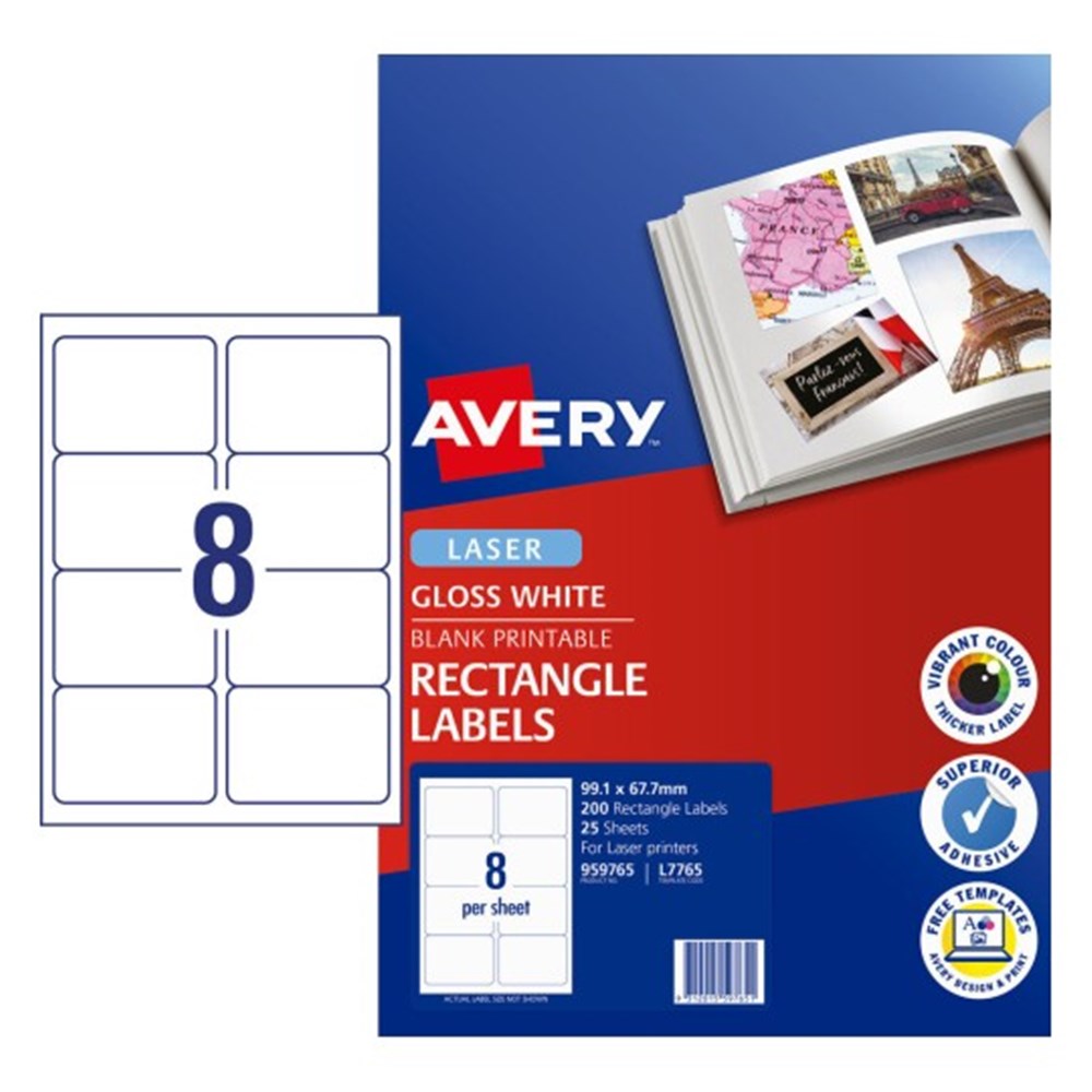 Avery Printable Labels L7765 99.1 x 67.7mm Rectangle Photo Gloss White 8UP 200 Labels