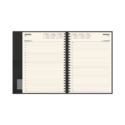 • Pen loop, lay flat opening, ribbon marker, day to page layout.