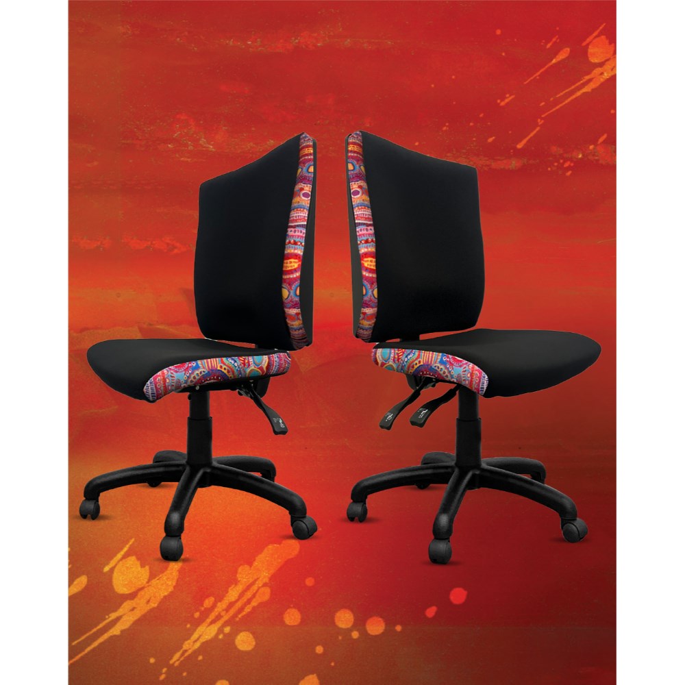 • A unique commercial fabrics designed by Murdie Nampijinpa Morris (Indigenous Artist) combined with K2 Black Fabric to upholster the chair.