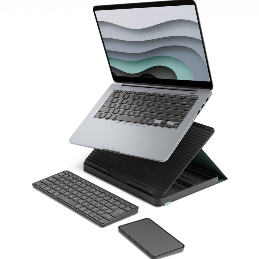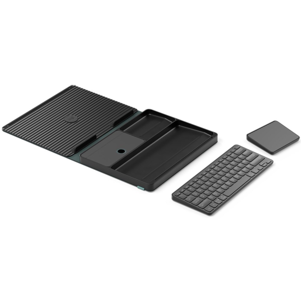 • Foldaway kit with laptop stand, keyboard, touchpad and storage.