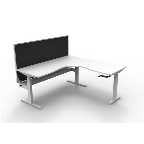 • Rapidline Boost manual crank height adjustable corner workstation with cable tray and screen. White top with white frame.