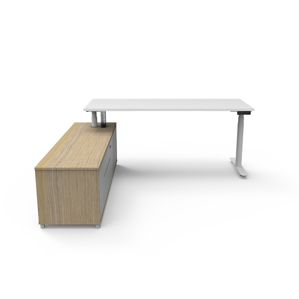 • Natural White top and White Satin frame. Height adjustable desk with left hand side cabinet.