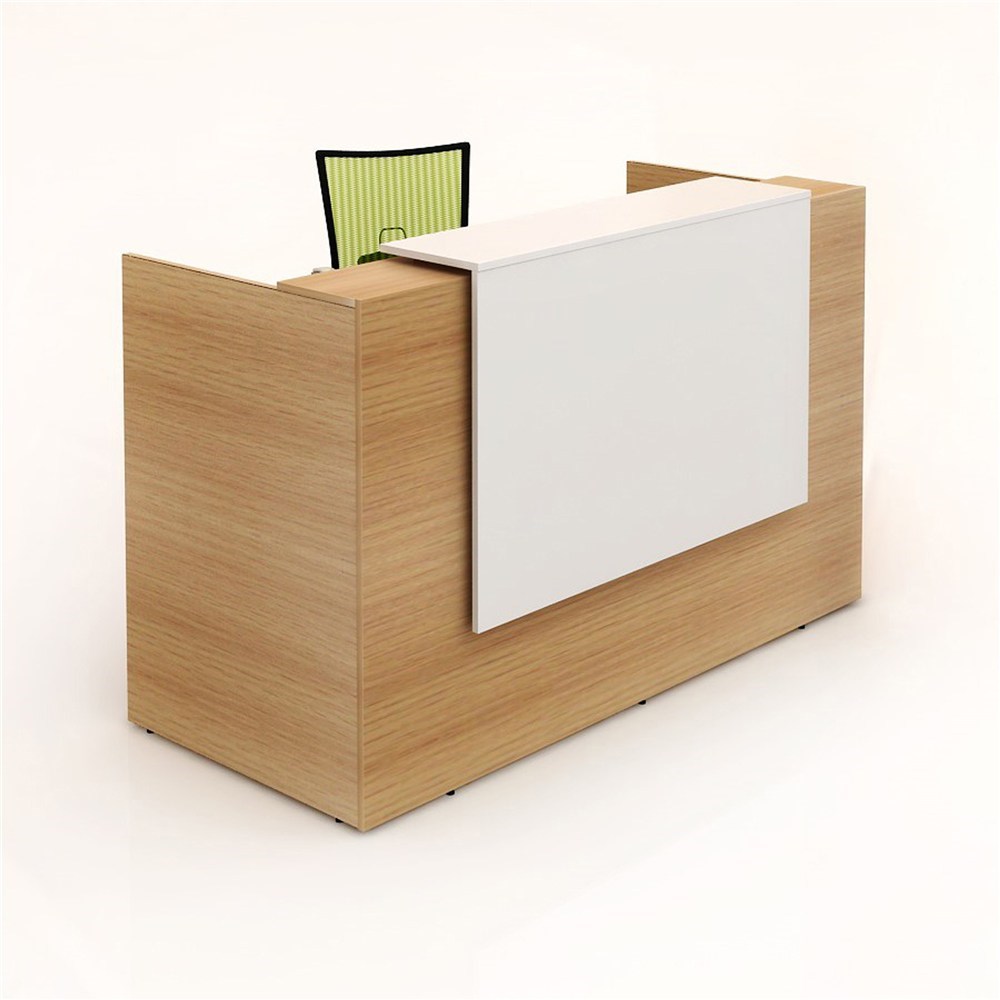 • Modern simple designed reception counter finished in Beech Melamine front and side panels with Gloss White feature panel and Matt White Melamine desktop.