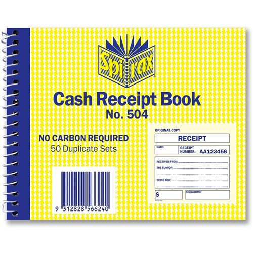 Spirax 504 Cash Receipt Book Carbonless 102 x 127mm 50 Duplicate Sets Side Opening