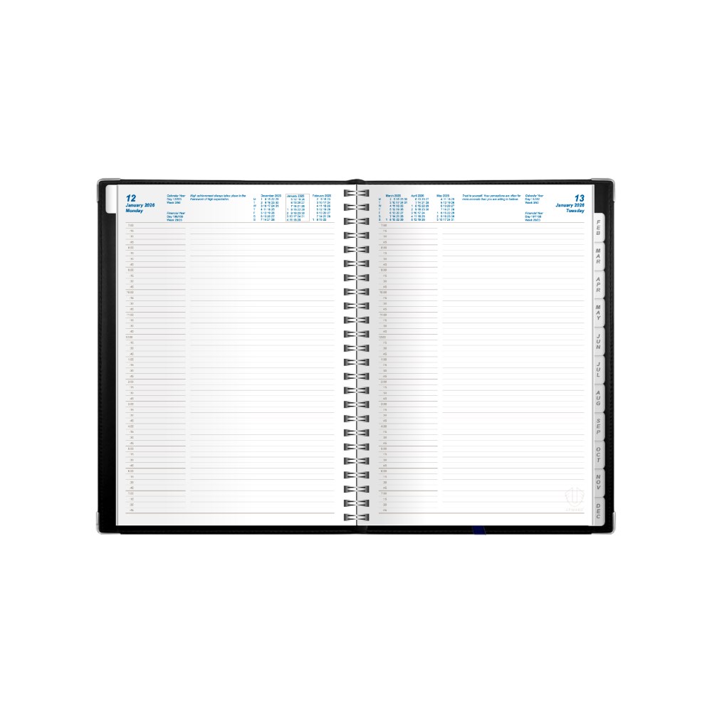 • Double wire binding. Lay flat opening. Ribbon marker. Tabs. Translucent pocket.