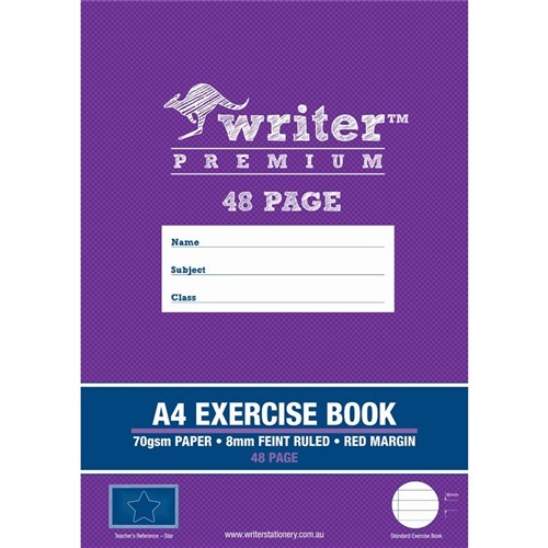 • Writer Premium Exercise Books feature heavy duty covers, high quality white 70gsm paper with blue ruled lines and a red margin
